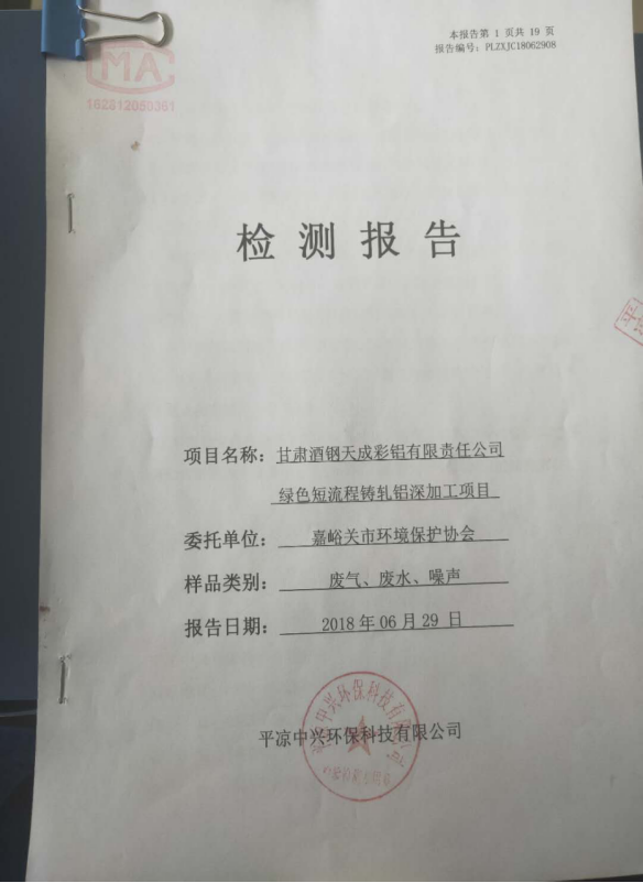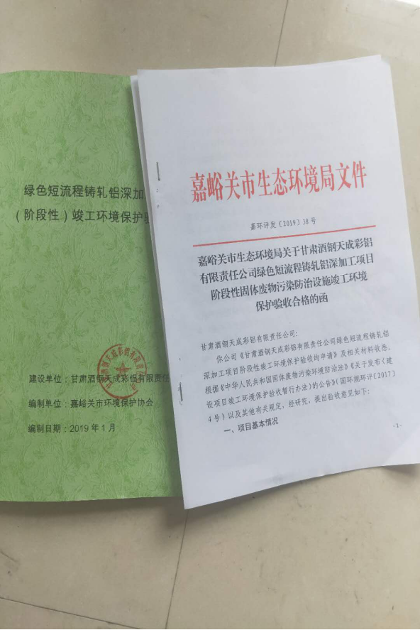 我公司環(huán)境影響報告書均通過省生態(tài)環(huán)境廳與市生態(tài)環(huán)境局審批,于2016年11月2日取得《嘉峪關市環(huán)境保護局關于酒鋼天成彩鋁有限責任公司綠色短流程鑄軋鋁深加工項目環(huán)境影響報告書的批復》嘉環(huán)評【2016】132號。并在2019年3月4日通過環(huán)保建設項目“三同時”(階段性)驗收,并取得環(huán)境保護驗收合格函。
