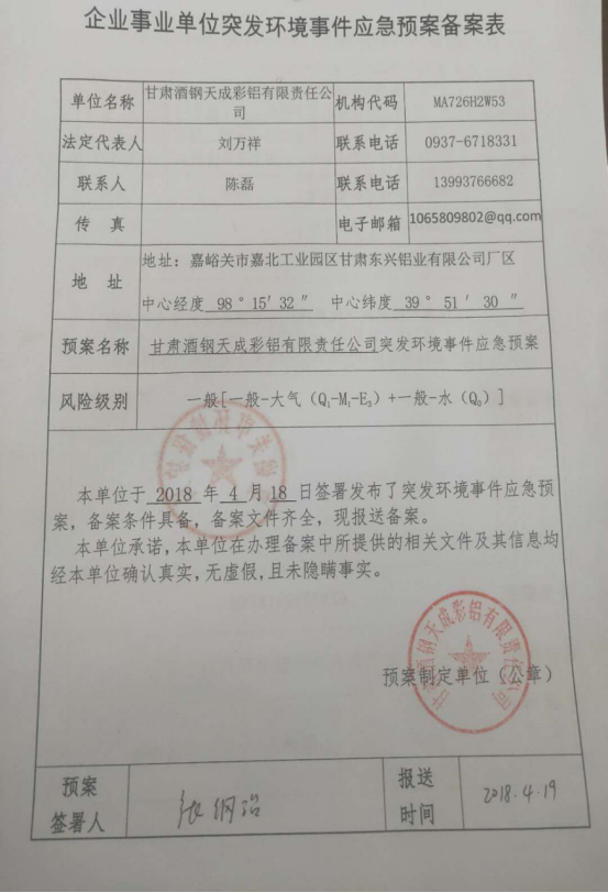 1. 應急預案名稱:甘肅酒鋼天成彩鋁有限責任公司突發(fā)