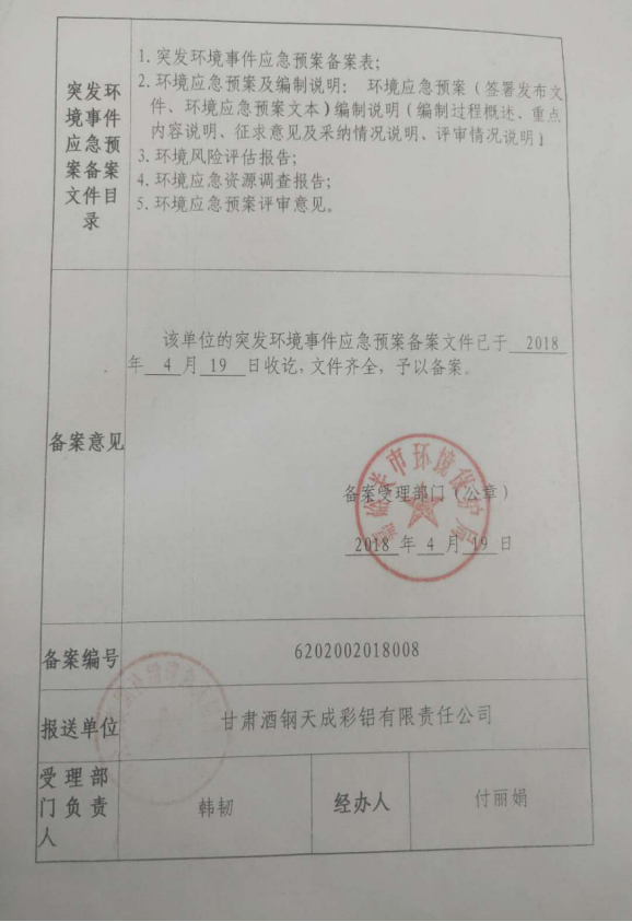 于2018年4月19日通過嘉峪關市生態(tài)環(huán)境局備案。