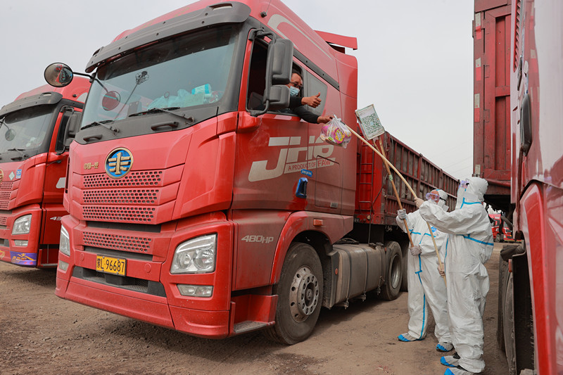 為統(tǒng)籌疫情防控和生產(chǎn)經(jīng)營(yíng),宏興股份公司儲(chǔ)運(yùn)部對(duì)外來(lái)貨運(yùn)車(chē)輛采取“不下車(chē)、零接觸”的辦法,完成原料檢驗(yàn)、過(guò)泵、卸貨工作,方便貨車(chē)司機(jī)順利卸車(chē)。同時(shí),該部及時(shí)了解司機(jī)所需,提供車(chē)輛維修、代送餐水等便利服務(wù),共同克服疫情帶來(lái)的不便。圖為儲(chǔ)運(yùn)部職工為貨車(chē)司機(jī)提供暖心的送餐服務(wù)。
