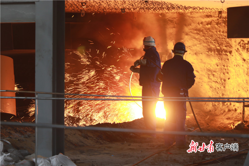 “鐵水出來(lái)啦!”職工們激動(dòng)地歡呼起來(lái),主控室內(nèi)掌聲如潮,高爐平臺(tái)鞭炮齊鳴。噴涌而出的鐵水,像一條“火龍”沿著出鐵溝蜿蜒流動(dòng),最終匯入爐臺(tái)下的鐵水罐中。